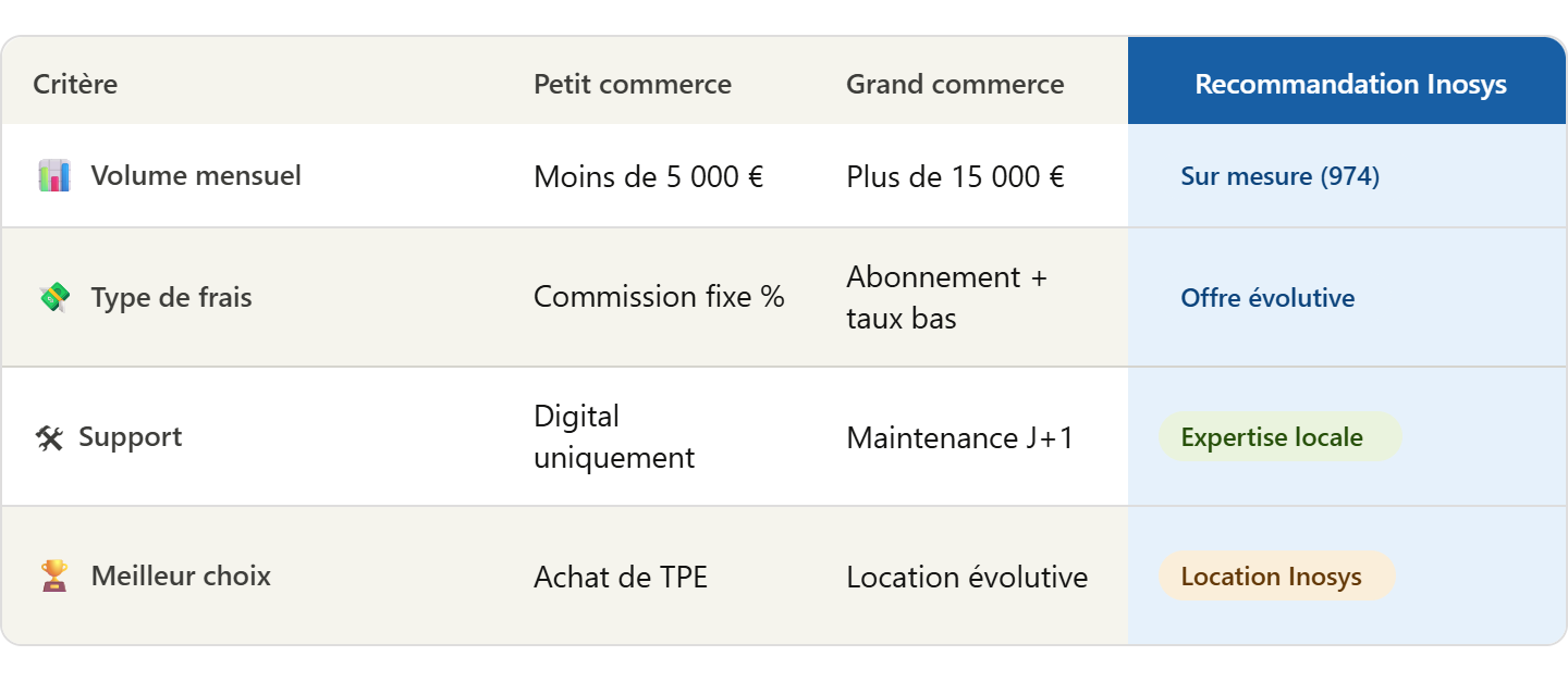 Pour savoir quel terminal de paiement choisir pour son commerce et optimiser votre encaissement, faites confiance à une expertise locale. Contactez nos experts monétique à La Réunion ou demandez un devis gratuit sur inosys.re.
