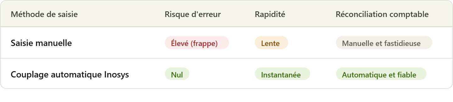 N'oubliez pas que le couplage de votre TPE avec un logiciel de caisse Inosys permet d'automatiser l'affichage du montant et d'éviter les erreurs de saisie manuelle pour une gestion encore plus sereine.